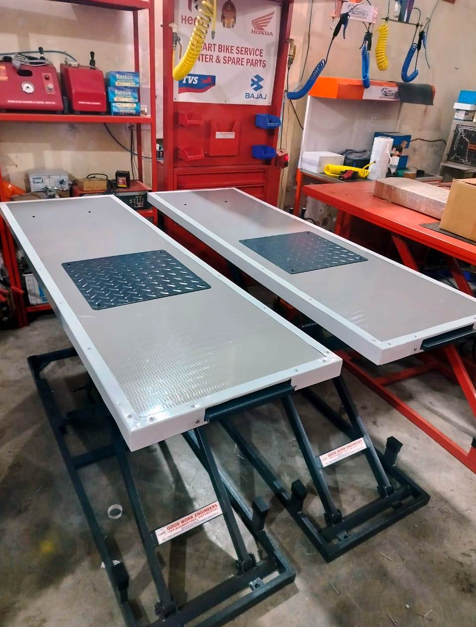 Incepted in 2020, we “Good Work Engineers”, are leading Manufacturer and Supplier of qualitative range of Two Wheeler Garage Equipments, Multi Brand Bike Ramp, Pneumatic Bike Lift, Hand Manual Ramp, Hydraulic Power Pack, Battery Charger, Panel Board, Digital Tyre Pressure Guage, Water Bench, Filter Regulator and Lubricator, General Hand Tools, Tools Trolley, Pneumatic Gun etc. Located at Faridabad, Haryana, India, we have constructed a robust infrastructural base that has helped us in gaining huge success in this domain. The infrastructural base comprises various divisions such as procurement, production, quality testing, R & D, warehousing & packaging and sales & marketing. The work in these divisions is carried out under the direction of highly experienced professionals. Our production division is outfitted with innovative machinery and technology that assists us to undertake bulk orders of clients and supply them products within stipulated time frame. Additionally, we also provide Field Survey Service to our valuable clients.